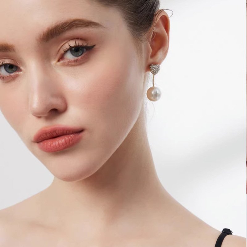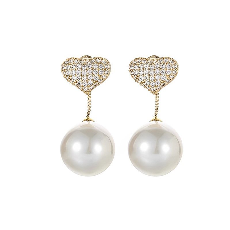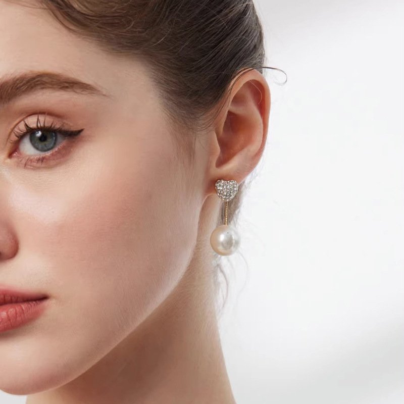 Diamond-encrusted heart-shaped pearl pendant earrings